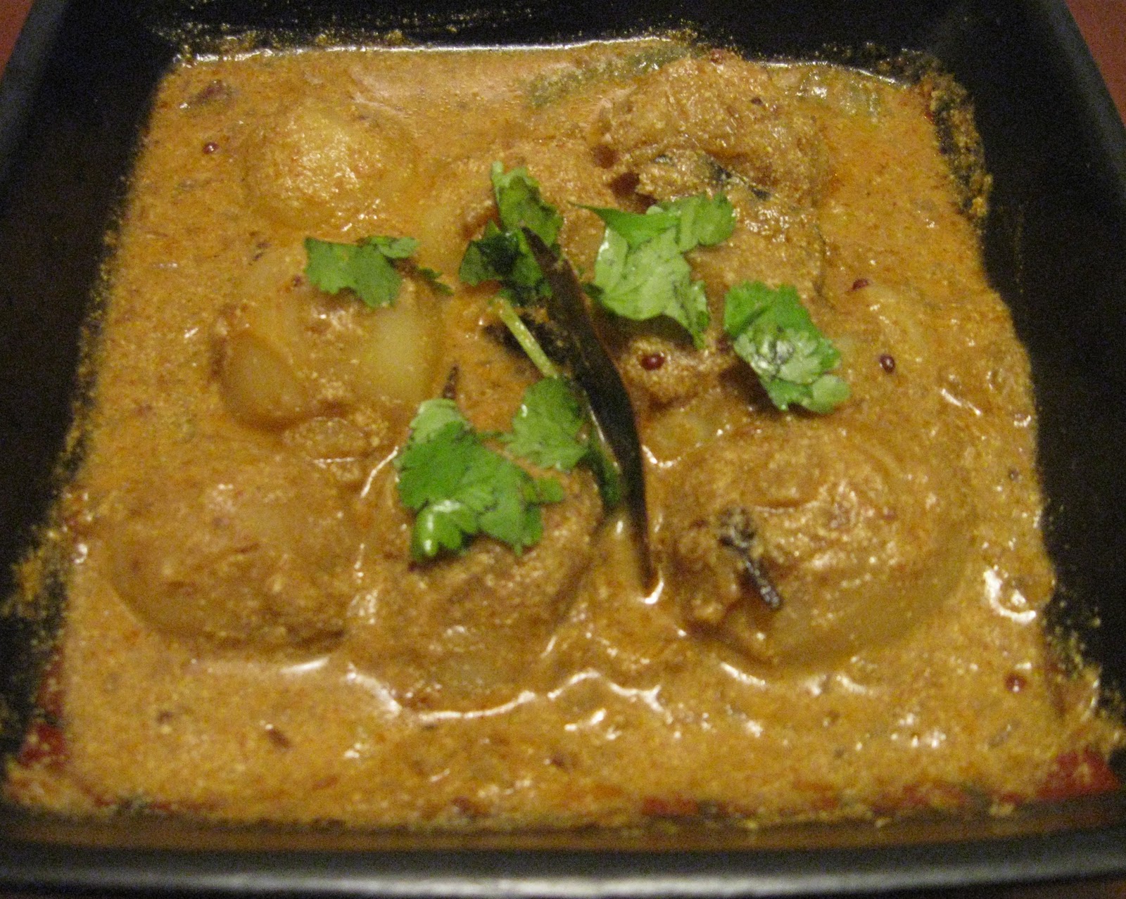 Heat 2 tbsp oil in a pan, add cumin seeds, and when they start spluttering, add the bay leaves, ginger, garlic paste and the tomato puree. Add all the dry spices for the gravy in the list above, and saute for about 2-3 mins. Add the blended yogurt to this mixture and cook everything on medium-flame for 8-10 mins. Keep stirring.